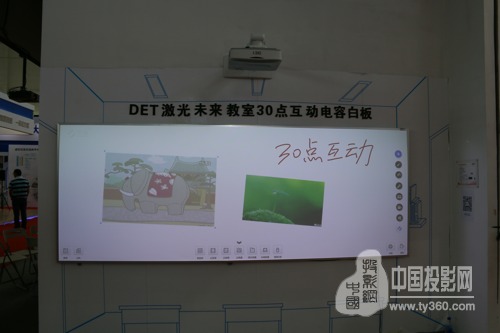 針對未來教室的解決方案,DET也在本次展會展示了激光互動未來課堂的嶄新體驗。它是由DET-T1與DET-Touch1搭建而成。DET-T1是專用于教學的超短焦、超寬屏激光教育投影機,亮度達3600流明,超短焦的特點能更大限度的節約教室空間,134寸的電容白板DET-Touch1可同時支持30點觸控,搭配專業軟件使用,可隨意拖放、拉甩畫面的各種文件,新穎的方式吸引了眾多觀眾的眼球。