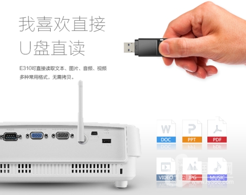 對于經常東奔西跑、辦公無定所的移動辦公族來說,投影機絕對是最雞肋的辦公工具。不可否認,投影機的百吋畫面會給提報講演增色不少,但要背著筆記本投影機和各種信號線滿世界跑,純爺們都吃不消。鑒于此,明基智能商務投影E310一方面貼心配備了免WIFI直連投屏方式,可直接變身熱點,無線連接手機等設備實現共屏,多設備展現方案,降低溝通成本;另一方面,明基E310還內置4.8G內存空間,并支持文本\圖片\音頻\視頻等文件U盤直讀,用戶可以選擇本機儲存或U盤直讀,明基智能商務投影E310便可獨立完成投影作業,無需隨時攜帶數據線和電腦,大大減輕了移動辦公用戶的負重壓力。