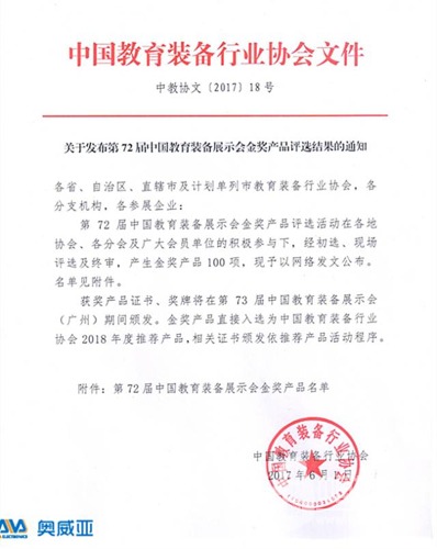 特大喜訊!中國教育裝備行業(yè)協(xié)會舉辦的第72屆教育裝備展示會產(chǎn)品評選,經(jīng)多輪評審,奧威亞移動錄播AE-V6榮獲第72屆教育裝備展示會金獎產(chǎn)品稱號,并直接入選為中國教育裝備行業(yè)協(xié)會2018年度推薦產(chǎn)品。3年磨礪,終成一劍,奧威亞移動錄播AE-V6終于獲得了同行及用戶的充分認可!