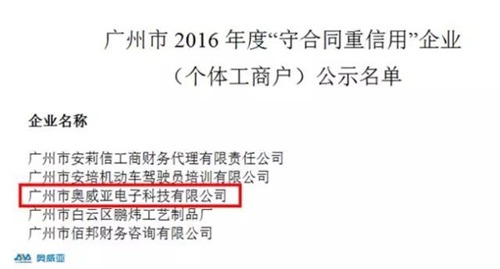 近日,廣州市工商局和廣州市工商行政管理局發布了2016年度“守合同重信用”公示企業的名單,廣州市奧威亞電子科技有限公司榜上有名!“守合同重信用”稱號的頒發,是對奧威亞誠信經營、守法經營的高度肯定。