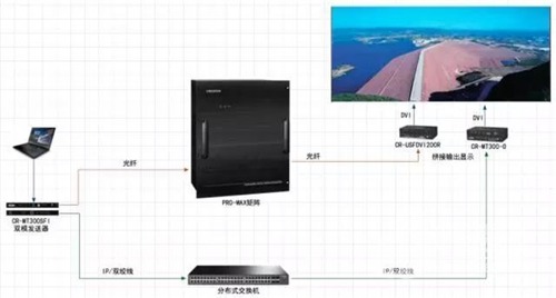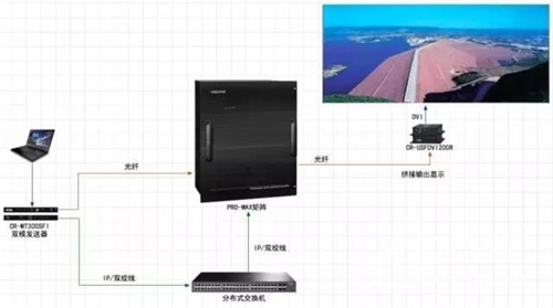 信號源-矩陣前端的備份:筆記本輸出到雙模發(fā)送器分別以光纖和IP網絡的方式傳輸?shù)絇RO矩陣,PRO矩陣拼接上大屏顯示。當矩陣的光纖輸入端有故障或者光纖線路中斷時,可直接調用通過IP方式備份的信號到大屏。