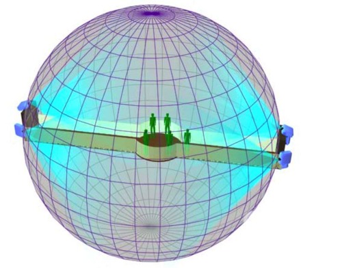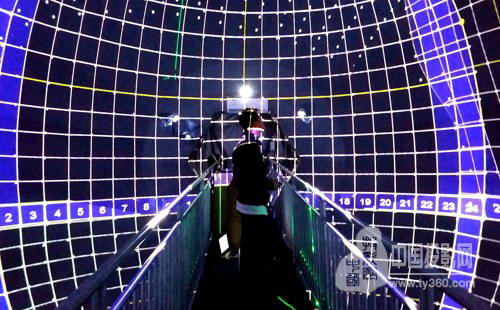 全景球幕影院是在一個球形的內部,投射出全圍合的影像。在球幕內部中心位置搭建一條貫穿整個球體的觀影通道,觀眾周身都被影像包圍,相比于時下流行的VR體驗,全景球幕影院擁有更宏大更精致的影像,體現真正的“全視景”。