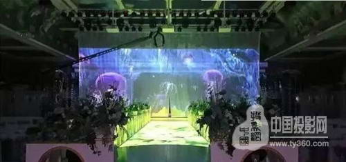 在宴會廳中,多臺日立HCP-D777X工程投影機將畫面投射在多塊超大環形全息紗幕上,讓婚禮步入“全息3D婚禮新時代”。