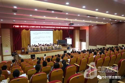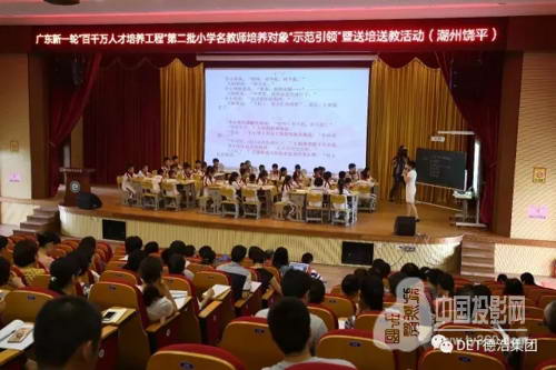 在學(xué)術(shù)報(bào)告廳里,饒平陽(yáng)光培英學(xué)校正在舉行廣東新一輪“百千萬(wàn)人才培養(yǎng)工程”第二批小學(xué)名教師培養(yǎng)對(duì)象“師范引領(lǐng)”暨送培送教活動(dòng)。