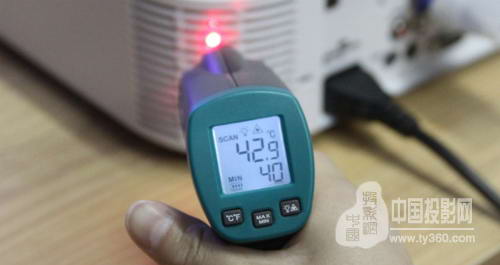 在散熱性能方面,測試當(dāng)天所在室內(nèi)溫度為23.5度的恒溫條件,索諾克Sonnoc SNP-X3500C固態(tài)光源投影機(jī)在進(jìn)過連續(xù)兩個小時的工作后,散熱口溫度為42.9度左右,整體看來溫度還算是在正常范圍內(nèi)。