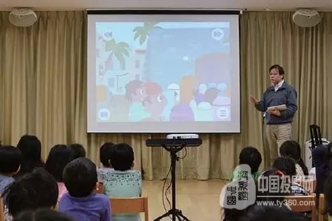 開始投影后,孩子們的視線會馬上緊緊注視著屏幕,會被佐藤先生講的故事深深吸引。原本視頻帶有英語字幕以及聲音,佐藤先生把視頻調成靜音,只使用畫面的播放形式,佐藤先生的講解配合著生動畫面的投影,達到了即使是幼童也能很好理解故事內容的效果。