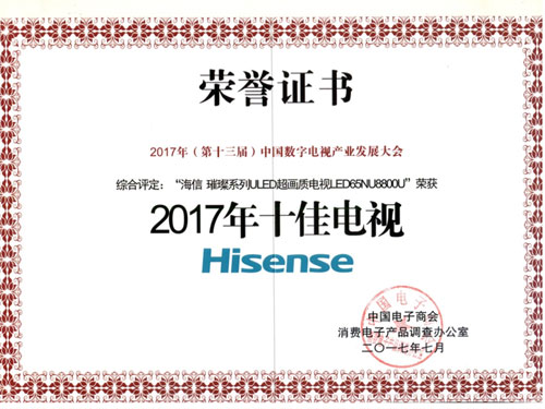 7月6日,在中國電子商會(huì)、中國電子技術(shù)標(biāo)準(zhǔn)化研究院共同舉辦的“2017年中國數(shù)字電視產(chǎn)業(yè)發(fā)展大會(huì)”上,隆重表彰了彩電行業(yè)表現(xiàn)出色的品牌和產(chǎn)品。海信電視憑借在國內(nèi)市場連續(xù)14年領(lǐng)跑、在全球高端市場高居前三的出色表現(xiàn),被評(píng)為“2017年消費(fèi)者喜愛的電視品牌”;海信璀璨系列ULED超畫質(zhì)電視依靠高畫質(zhì)、高顏值和高體驗(yàn)的突出表現(xiàn)榮獲“2017年十佳電視”大獎(jiǎng)。
