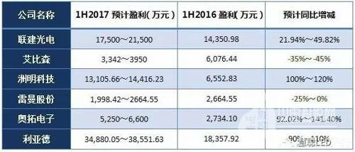 6月29日,聯建光電發布2017年半年度業績預告,2017 年 1 月 1 日~2017 年 6 月 30 日期間,公司實現歸屬于上市公司股東的凈利潤:17,500.00 萬元~21,500.00 萬元,預計比上年同期增長:21.94%~49.82%。