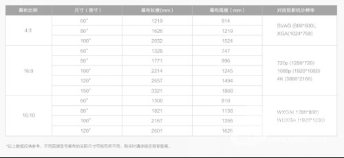 觀看電影多使用16:9、16:10的幕布,展示PPT和文檔時則4:3、16:10更為常見。一般的客廳和小型企業會議室適合懸掛1.5-2米長度的幕布,對應下表,XGA分辨率的投影機是上乘選擇,既能夠高清呈現大片風范,又足夠清晰展現會議文檔細節。