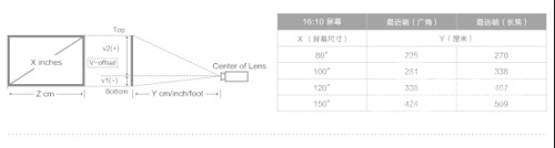 不同的投影機因幕布尺寸和比例不同,所需的投影距離也不同。參照下圖,假設選擇80’’、16:10的幕布,投影機則需要放置在距離幕布2.25m-2.7m處,這也比較符合一般客廳和會議室的。