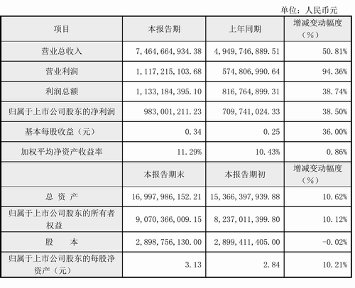 1、報(bào)告期內(nèi)公司實(shí)現(xiàn)營業(yè)總收入7,464,664,934.38元,較上年同期增長50.81%,實(shí)現(xiàn)營業(yè)利潤1,117,215,103.68元,較上年同期增長94.36%,實(shí)現(xiàn)利潤總額1,133,184,395.10元,較上年同期增長38.74%,實(shí)現(xiàn)歸屬上市公司股東凈利潤983,001,211.23元,較上年同期增長38.50%。