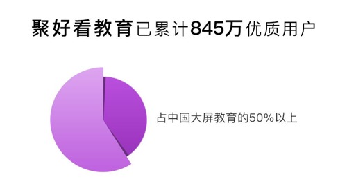 聚好看教育也已累積845萬的優質用戶,占中國大屏教育的50%以上。聚好看教育提供家庭場景全角色服務,覆蓋學前、小學、初中、高中、英語、興趣、職業七大角色的所有需求,匯聚30萬+小時專業課程,83%特高級教師,97.2%重點名校一線教師,是大屏教育的首選。