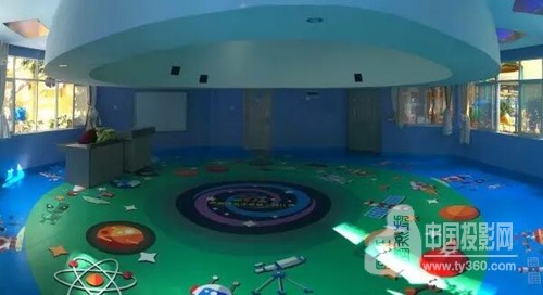 球幕影院亦稱“穹頂影院”,畫面來源于通過多臺激光投影機拼接融合,將穹頂作為一個球形銀幕。該中學天文館采用6臺視美樂工程投影機PF450。天文館四周環繞著星座與星象圖片, 地面鋪設印有星系的地毯,具有科技感的同時又不失童趣,十分迎合當下中學生的心理。當學生站在穹頂熒幕之下仿佛遨游太空,被宇宙星云所包圍。
