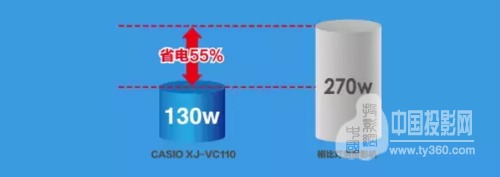 卡西歐投影機從2010年開始即不使用燈泡,采用激光+LED的混合光源,使得功耗大大降低,減少了后期使用時的電力成本。這款XJ-VC110投影機功耗僅為160瓦,相比傳統(tǒng)的燈泡投影機省電高達55%。