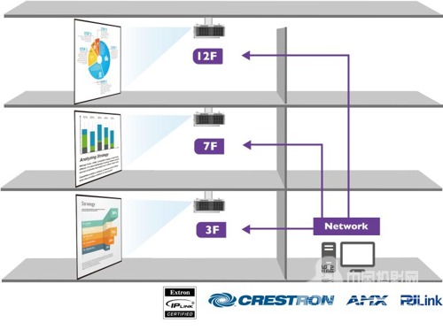 而對于像全員培訓會、年中總結大會、新聞發布會等大型會議,由于參與人數眾多,現場一般需要設置3-5面左右的大屏幕,以方便會場上所有的與會者觀看演講PPT。基于此,明基高清高亮投影機SH753不僅特別增設LAN網絡接口,還支持多種主流品牌的控制協議,廣泛兼容包括Crestron,AMX,Extron *和PJ-Link在內的投影機控制系統,通過LAN網絡控制可實現簡報內容的多個屏幕同步展示,既便于會議現場管理,又可減少不同投影機之間,以及投影機與PC間的連線,美化會議環境。