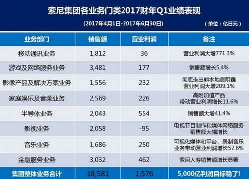 2017財年第一季度,索尼公司銷售收入與上年同比上升15.2%,為18,581億日元(165.90億美元)。銷售收入增長的主要原因是:金融服務業務和半導體業務銷售收入的增長。