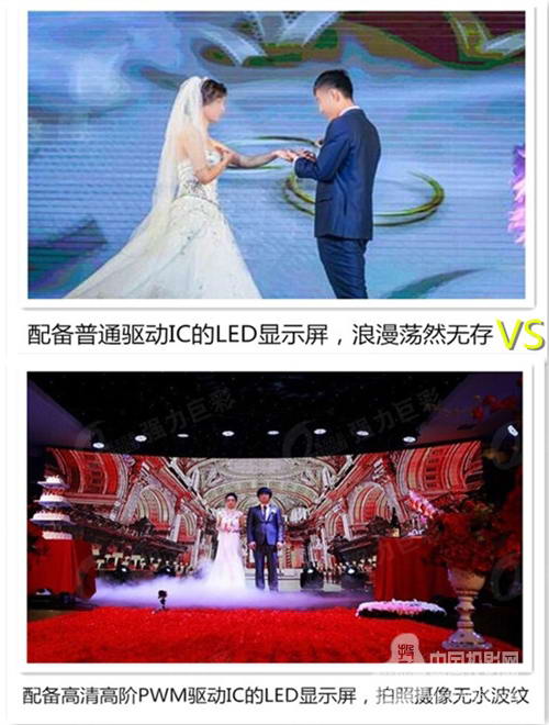 強力巨彩Q系列Q3及以下產品、高密度、標準系列(租賃)、室內S系列、A系列等產品均配備高清高階PWM驅動IC,刷新率可達3840Hz,拍照攝像均無水波紋,不頻閃;灰度高達14-16bit可調,畫面色階更為平滑,細節顯示效果細膩逼真,可滿足新人每一個重要時刻拍攝的需求,讓新人見證婚禮中每一個感動的瞬間,記錄永恒的美好。