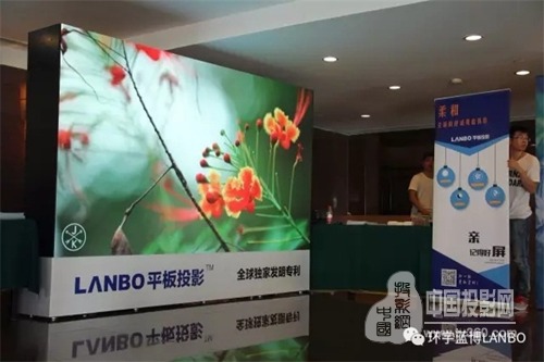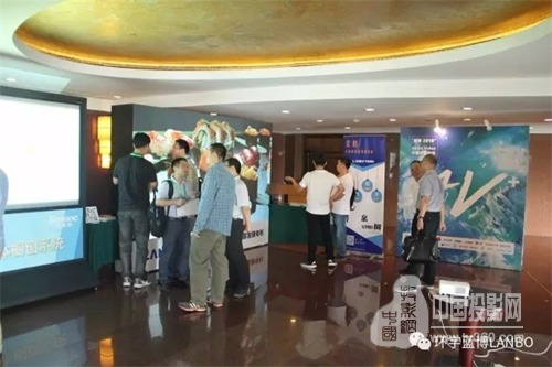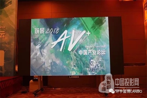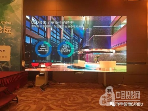 論壇會議廳的門口,LANBO同時也展示了雅典娜系列145寸平板投影,在像素顯示方面,較阿波羅系列每平米提升了44%的顯示像素,在同等顯示尺寸,雅典娜系列顯示的畫面更細膩,更出色。