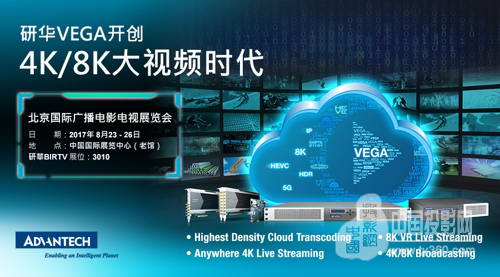 全球互聯網運算與高清視頻科技平臺開發領導者研華科技,即將于8月23-26日亮相北京國際廣播電影電視展覽會(以下簡稱BIRTV),并發布最新VEGA視頻、8K 實時編碼和4K云轉碼方案。在BIRTV2017中,研華以“4K/8K 開創VEGA大視頻時代”為主題,重點展示8K 實時編碼、4K云轉碼方案等七大主題,全面加速推進4K/8K 超高清流媒體應用。