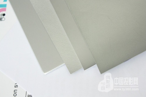 這里配上四種屏幕的圖片近照,可以仔細看看幕面粗糙程度,這個決定了畫質的細膩度。偏振還原性是看不出來的,需要購買樣品評測。(下圖從左至右依此是:鋁塑板,電動金屬幕,日本OS納米PVC畫框幕,高清PVC畫框幕)