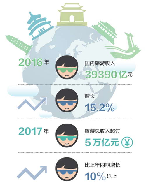 近年來中國旅游業一直保持高速發展,已然成為國民經濟戰略性支柱產業。2016 全年國內游客44 億人次,比上年增長11.2%,國內旅游收入39390 億元,增長15.2%。入境游客13844萬人次,增長3.5%。2017 年全國旅游業發展的預期目標為旅游總收入超過5 萬億元,同比增長10%以上;國內旅游人數超過48 億人次,增長11%以上;完成投資超過1.5萬億元,增長20%。