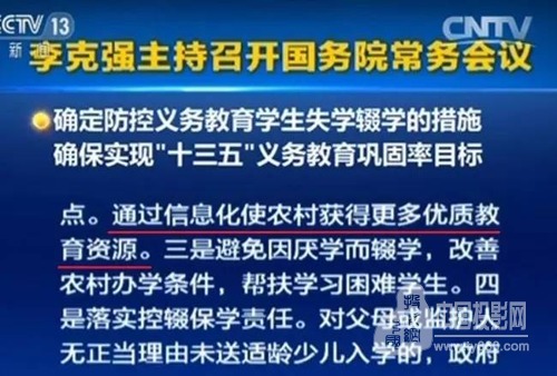 “用信息化手段使農(nóng)村獲得更多優(yōu)質(zhì)教育資源”,李克強總理在國務院常務會議上重點提到。為進一步防控義務教育學生失學輟學,確保實現(xiàn)到2020年全國九年義務教育鞏固率達95%的目標,近日,國務院總理李克強主持召開常務會議,對保障入學率、促進優(yōu)質(zhì)教育資源不均衡問題提出了指導意見。