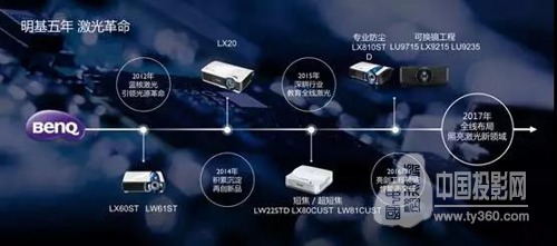據陳凱耀介紹,基于對新光源前瞻性判斷,明基在2012年推出藍核激光投影機LX60ST與LW61ST,開啟光源革命。經積累沉淀后于2014推出升級版LX20,其后又在2015推出面向教育行業的LW22STD、LX80CUST、LW81CUST三款短焦/超短焦激光投影機,于2016年推出一系列可換鏡激光工程投影機。
