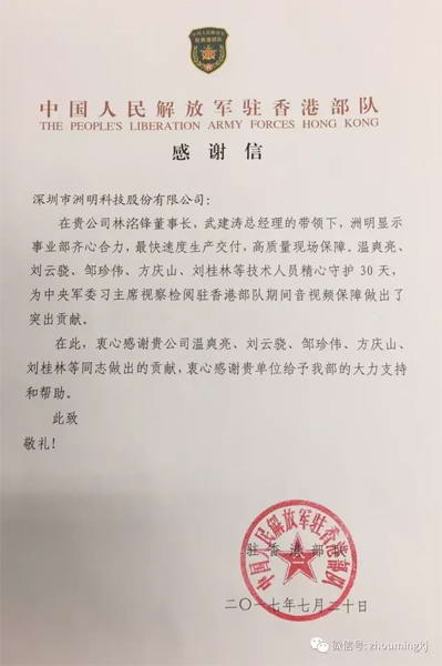 匠心品質,不辜負每一份信任與選擇!近日,洲明科技收到一封來自中國人民解放軍駐香港部隊(以下簡稱“駐港部隊”)的《感謝信》, 信中,駐港部隊感謝洲明科技最快速度生產交付,高質量現場保障,為中央軍委習主席視察檢閱駐香港部隊期間音視頻保障做出了突出貢獻,尤其對洲明LED顯示屏過硬的產品質量和洲明工作團隊提供的優質技術保障與服務提出了表揚。