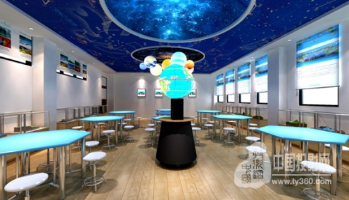 該教室占地102.25平方米,風格上依然延續藍白風,設計簡約又充滿科技感。與以往專用地理教室相比,教室吊頂層不僅有宇宙星空演示用的天文穹頂,還增加了懸掛式立體太陽系星球,在燈光的襯托下仿佛置身于其中,宇宙的無窮奧秘等著你去探索,這種情境式的教學環境能夠使學生快速進入學習地理的狀態,提高課堂效率。
