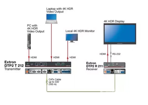 通過單根 CATx 屏蔽電纜將 HDMI 以及控制和模擬音頻信號延長至 100 m 遠的距離