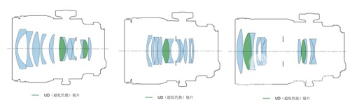鏡片組結構圖 (左:TS-E 50mm f/2.8L 微距、中:TS-E 90mm f/2.8L 微距、右:TS-E 135mm f/4L 微距)