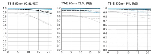 MTF曲線圖 (左:TS-E 50mm f/2.8L 微距、中:TS-E 90mm f/2.8L 微距、右:TS-E 135mm f/4L 微距)