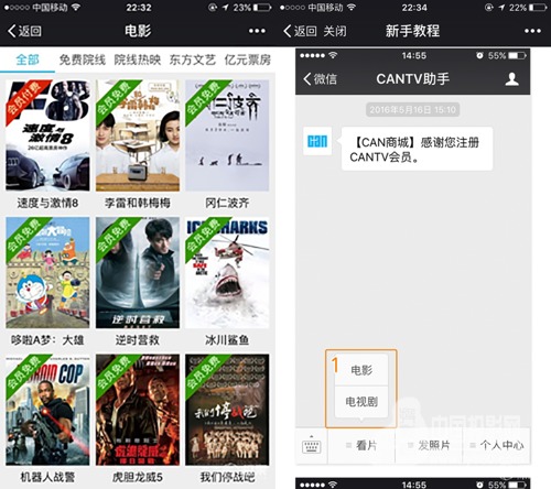 在微信中找到“CANTV助手”公眾賬號,在下方導航欄選擇電影或電視劇。瀏覽頁面選好影片后,點擊“用電視看”即可在X1上播放,首次使用系統會提醒你沒有關聯到投影設備,點“新手教程”便會得到相應步驟。綁定后就可以投放觀看啦。