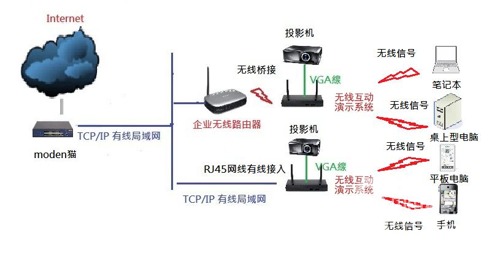 無線互動演示系統使用無線或有線橋接功能與教室的無線AP路由器橋接或以RJ45網線跟無線互動演示系統連接實現邊投影邊訪問網絡資源的功能。