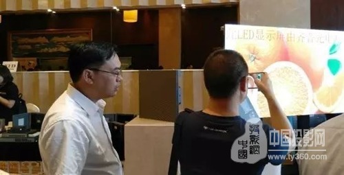 圖為齊普光電副總經(jīng)理?xiàng)钣⒚飨壬蛑貞c安防客戶介紹金錢豹小間距產(chǎn)品