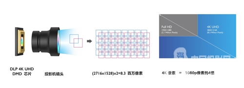 談到4K投影,就要從實現(xiàn)4K分辨率的核心組件——投影芯片說起,明基在開發(fā)DLP激光投影過程中得到了戰(zhàn)略伙伴德州儀器(TI)大力支持,其研發(fā)的TRP(Tilt & Roll Pixel)技術(shù)為DMD芯片的數(shù)字微鏡賦予全新像素架構(gòu),實現(xiàn)0.66英寸4K DMD單芯片方案,以真正830萬像素,完勝偽4K機型,使得畫面細節(jié)表現(xiàn)更出色。