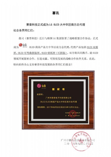 近日,賽普科技官方網站公布一則消息:該公司已于日前正式與韓國LG集團簽署了戰略聯盟合作協議,成為 LG OLED商顯產品大中華區南方總代理。