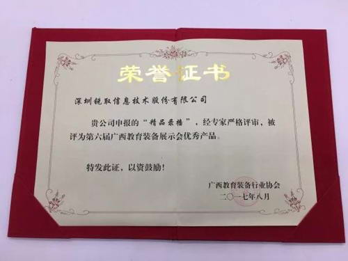 近年來,銳取不斷創新推出智慧教育系統,且裝備產品的質量逐步提高。為進一步促進與教育裝備行業協會的互動交流,提高品牌錄播產品的知名度,銳取參與了第六屆廣西教育裝備展優秀產品的評選活動。