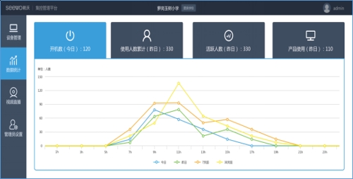 系統平臺能自動采集終端設備使用數據,并匯總輸出分析報表。可自動檢測設備的開機率、開機時長、設備的活躍度 排名及應用軟件使用情況等,方便管理員客觀、準確了解設備的真實使用情況。同時,區域集控管理可統計區域內各校設備使用情況,方便區域管理者的多維度了解分析。