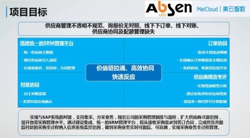 此項目是艾比森采購業(yè)務(wù)信息化的創(chuàng)新,以業(yè)務(wù)主導(dǎo),借鑒先進(jìn)集團(tuán)業(yè)務(wù)和項目管理經(jīng)驗,以及合作伙伴的成功應(yīng)用經(jīng)驗,將全面支持采購各項業(yè)務(wù)。