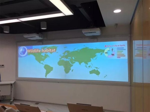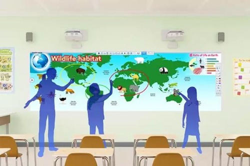 雖然投影屏幕是二合一,但是通過Epson CB-696Ui的幾何校正功能,對拼接的大屏畫面進行細微處的校正,最終達到無縫拼接,不但不會影響老師的課件展示,還支持6點手指+2點互動電子筆同步觸控*2。老師和學生們依然可以在超寬屏畫面上進行正常的互動,也可以在顯示屏上的任何位置書寫、批注,不會因為拼接而出現(xiàn)一些書寫有間隔、畫面不平整的問題。
