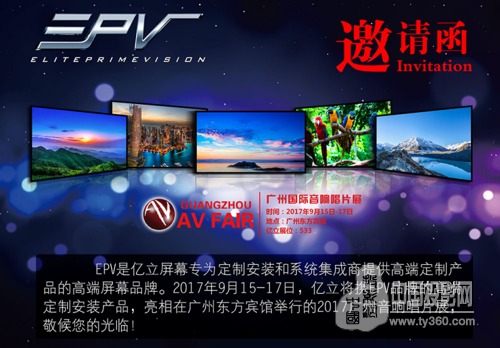 EPV是億立屏幕專為定制安裝和系統(tǒng)集成商提供的高端定制產(chǎn)品的高端屏幕品牌,滿足消費(fèi)者更高品質(zhì)要求的投影應(yīng)用。多款EPV產(chǎn)品將于9月15-17日在廣州音響唱片展亮相,整體陣容霸氣十足,為消費(fèi)者帶來(lái)全新視覺(jué)體驗(yàn)。億立與您相約廣州東方賓館,不見(jiàn)不散!