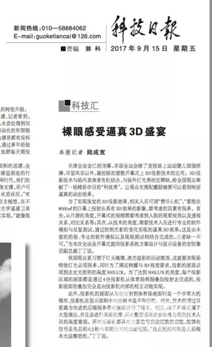 天津全運會已經閉幕,本屆全運會除了競技場上運動健兒頑強拼搏、盡顯風采以外,最搶眼的要數開幕式上3D投影技術的應用。3D投影技術與場內表演者有機結合,與場外燈光秀相互輝映,給全國觀眾奉獻了一場精彩奪目的“科技秀”。讓觀眾無需配戴眼鏡便可以看到絢麗逼真的動態效果。