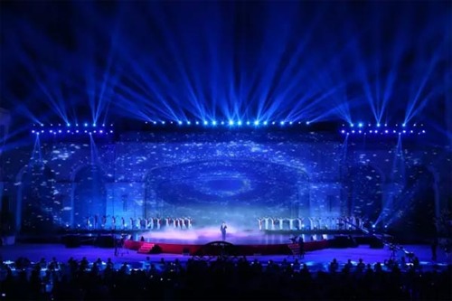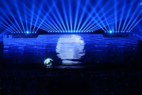 除了要完美表現(xiàn)創(chuàng)意內(nèi)容,現(xiàn)場還需克服包括大幅度幾何校正、拼接融合、多圖層疊加、多點校正等諸多問題。其中,最為緊要的一項便是對亮度和清晰度的準(zhǔn)確控制。在藝術(shù)總監(jiān)徐強看來,投影機機位選取不能影響整體布局,而鏡頭景深又要保證每個區(qū)域都清晰不模糊,既不能使800平米的投影表現(xiàn)隱沒于現(xiàn)場燈光秀之下,又要使投影表現(xiàn)與藝術(shù)家的現(xiàn)場表演相得益彰。