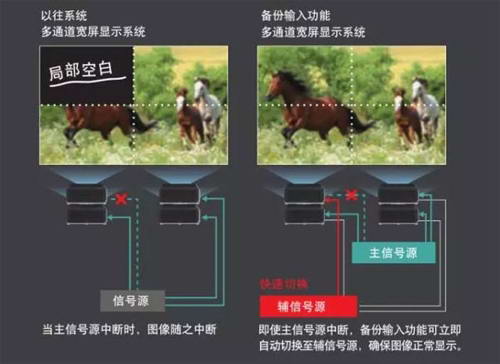 內置多畫面拼接系統,當多臺投影機同時投影時,色彩匹配功能能夠修正各臺投影機投射出來的細微色彩差異。每臺投影機運行一段時間后都會發生不同程度的亮度和色彩變化,多臺投影機亮度色彩控制功能可自動校正多通道拼接系統的亮度和色彩一致性。