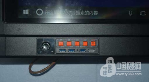 前置接口位于邊框左下方,配備了3個USB 3.0的接口、1個HDMI接口,方便老師外接筆記本、U盤或者移動設備,我們都知道,USB 3.0傳輸速度更快,觀看高清的視頻也不卡頓。接口上方5個橘色按鈕分別是主頁(HOME按鍵)、音量±、節能和綜合設置,可以說包含了日常主要的功能需求。此外,還值得一提的是,下方接口鍵的中間有一個圓形按鈕,這是鴻合為了防止外接設備感染病毒而配備的一鍵恢復系統功能,操作相對便捷,看出鴻合對教學環境的細節考慮周到。