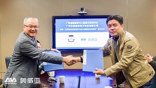 (華南師范大學副校長胡欽太與公司創始人歐俊文先生共建“華南師大奧威亞智慧學習技術創新聯合實驗室”簽約儀式)