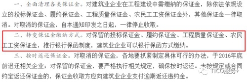 2017年6月20日發文強調“推行銀行保函制度,承包人可以銀行保函替代預留保證金”