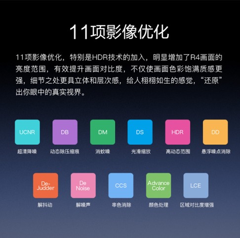 酷樂視R4,使用了11項影像優化,其中特別是HDR的加入,明顯增加了畫面的亮度范圍,有效提高畫面對比度,不僅使畫面色彩飽滿質感更強,細節之處更具立體和層次感,給人栩栩如生的感覺,還原出你眼中的世界!