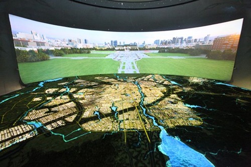 長春展覽館核心展項——多媒體沙盤廳是一個半球形的立體空間,地面是碩大的智能化大型城市沙盤,周邊是雙曲面弧形屏,頂上是天幕聯動投影。如此復雜、獨特的沙盤廳設計上在國內是獨一無二的,視覺效果非常震撼。